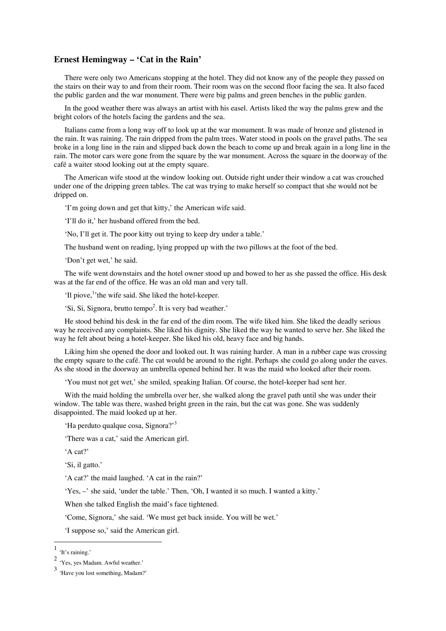 A very short story ernest hemingway one hot evening in padua they carried him up onto the roof and he could look out over the top of the town. Names characters places and incidents either are products of the authors imagination or are used fictitiously. It contains the classic first forty nine stories plus a number of other works and a foreword by his sons. On this side there was no shade and no trees and the station was between two lines of rails in the sun.